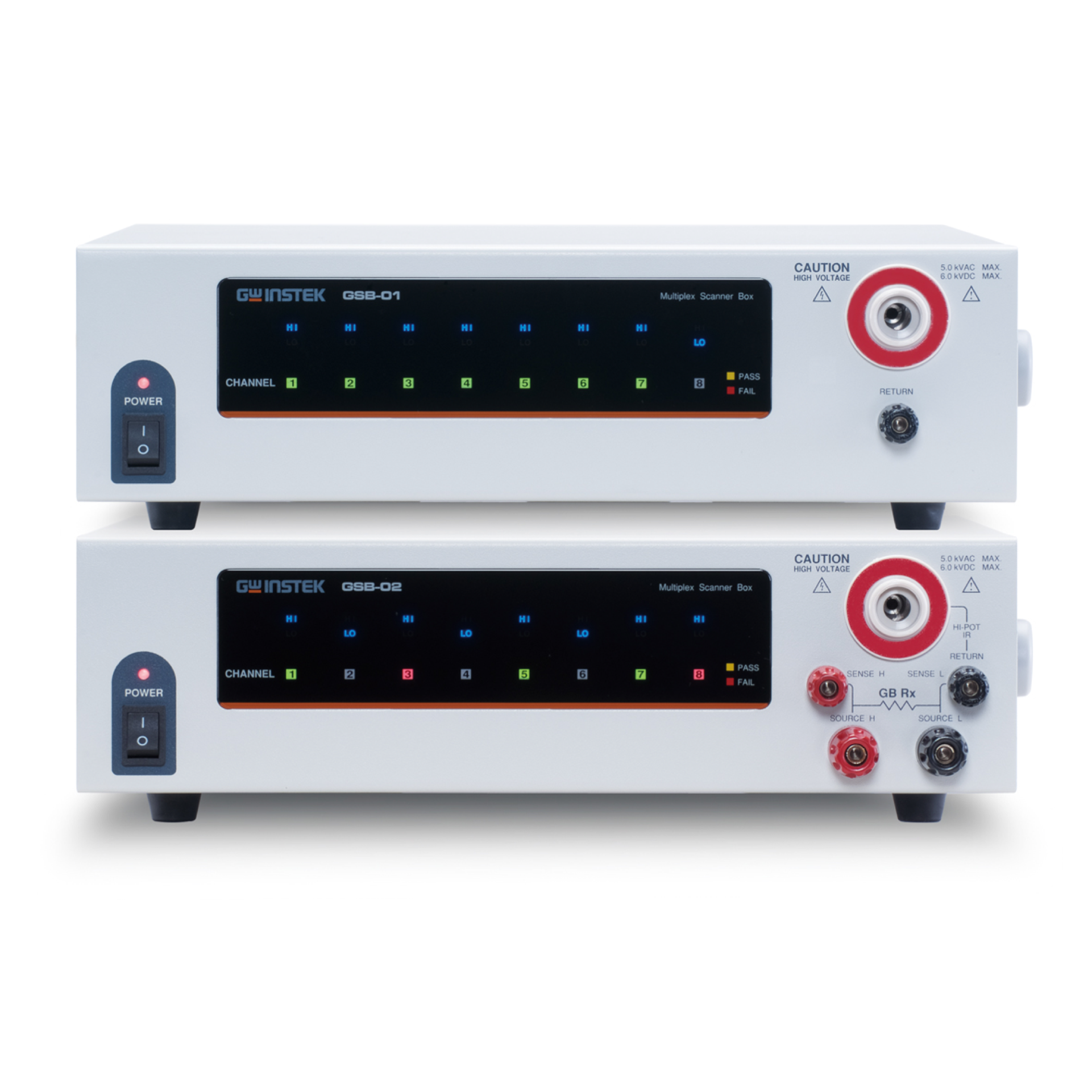 GW Instek presents a dedicated option, multiplex scanner box, for specific safety tester series. This multiplex scanner box, GSB-01/02, has a function that distributes the test voltage or current provided by the GPT-9800/9900/9900A series to multiple test points. Up to eight channels can be used for outputs on one scanner. Operator can conduct AC/DC withstanding, insulation resistance and ground bond test on test points depending selected scanner model. Furthermore, up to four scanners can be connected to the tester, allowing a maximum of 32 channels. These features ensure highly reliable and labor-saving for electrical and electronic equipment with multiple test points.